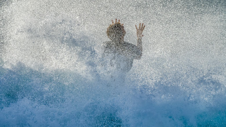 If you see the wave approaching and are on dry sand, move back quickly. If you're in the water, you have two options. One, attempt to dive through the wave before it breaks. To do this, you should turn sideways, drop the shoulder closest to the wave, and lunge into the wave. It is helpful to push off the bottom in order to gain enough force to push through the wave. The other option is to turn towards shore and try to ride it out. If you don't have a board, or have it pulled away, you can try to body surf your way in by launching your body across the water with arms extended and spine straight just in front of the approaching white water.