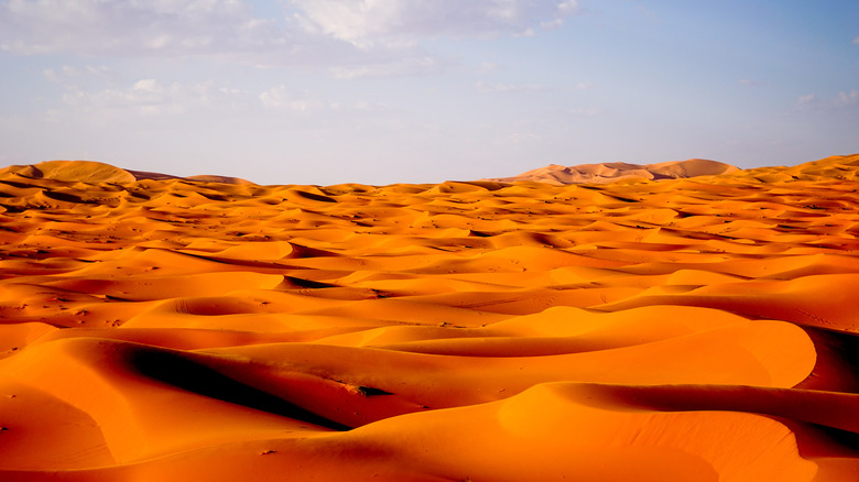 Erg Chebbi is a magnificent stretch of the Sahara Desert, known for its sea of towering orange dunes that extend as far as the eye can see. Rising up to 500 feet (150 meters) high, these dunes offer a variety of thrilling adventures. For adrenaline junkies, sandboarding down the steep slopes or taking a 4x4 off-road adventure across the dunes is a must. Camel trekking is another popular activity here, allowing you to experience the tranquility of the Sahara. Picture yourself riding along as the sun begins to set, casting long shadows across the desert. Later, as the sun dips below the horizon, the sands take on a deep red hue, creating a mesmerizing backdrop. It's a magical experience that highlights the stunning colors of the Sahara. As the night falls, you can settle down for an evening under the stars in a traditional Berber camp, where you can fully absorb the desert's serene beauty.