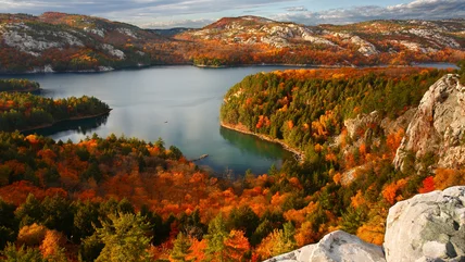 Home to one of the world's most adventurous destinations — the Cabot Trail — Cape Breton Highlands National Park is renowned for its dramatic coastal views and stunning fall foliage when the season turns. As the leaves change in October, the region's rolling hills and rugged coastline become a canvas of fiery reds, vibrant oranges, and sunny yellows. The park's diverse habitats, from hardwood forests to rolling meadows, make it the perfect stroll for experiencing the beauty of autumn.