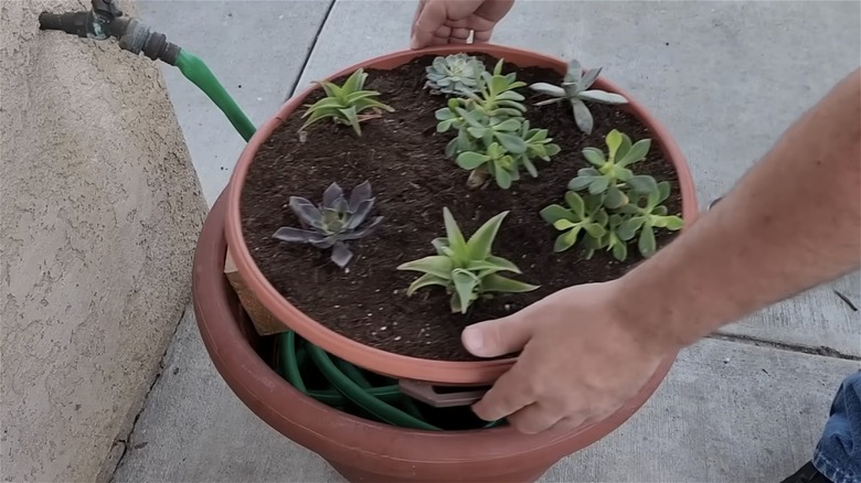 Beyond this, your pot is easily customizable. You can even use weatherproof paint to decorate the outside of your pot. Last, while the planter base is meant to cover the hose and create a clean, minimalist look, you can also place additional décor items on top to create a stylish garden centerpiece. Add a small potted plant, or even a garden ornament to elevate the design (check out this DIY pot by Hometalk with succulents on top). This makes your storage solution both functional and aesthetically pleasing.
