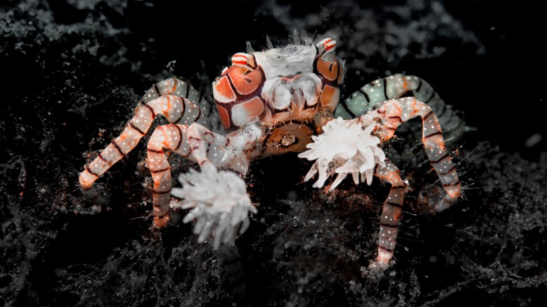 While these poms may appear to be harmless appendages, they are neither harmless nor part of the crab. Rather, when it's time to fight, the pom-pom crab grabs a toxic sea anemone in each claw and uses them as a weapon. Lest they be caught unarmed, the pom-pom crab actually carries the sea anemones with them wherever they go. However, it's not as if the anemones are being held hostage. These two sea creatures have somewhat of a codependent relationship and rely on one another for survival.