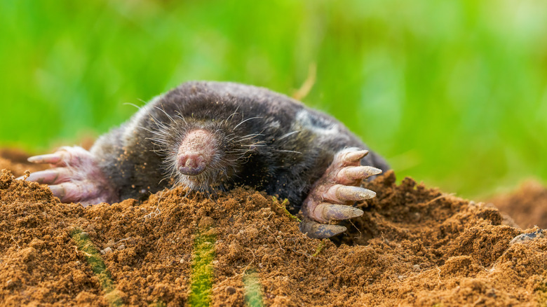 Moles need points of entry and exit for the rare occasions on which they emerge from underground. When they do decide to come topside, they create small dirt mounds known as molehills. Though deeply damaging and unattractive, the presence of these hillocks not only shows you where the mole emerged, but gives you access to its network of tunnels underneath your yard.