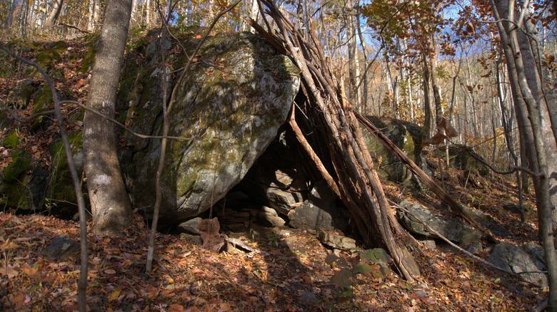 Natural materials can also be incorporated into your build. Limbs and branches can be utilized as tent poles and/or stakes. If you don't have any material with you to help with the build, you can also construct a shelter completely from natural materials. Limbs and brush can be leaned against a cliff, large rock, or tree. Limbs and branches can also be stacked together in a teepee configuration. Additionally, you can utilize any existing natural shelters, such as rock overhangs, caves, or large hollow logs, although take care not to build fire inside any of these structures.