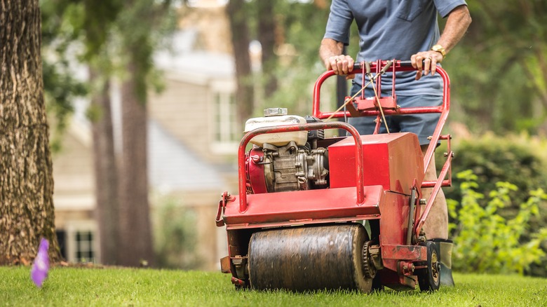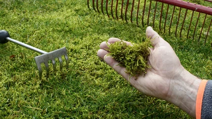 If you already water and mow your lawn properly, Walts also has other recommendations for getting rid of the moss in your yard. "Aerating the lawn can also be a highly beneficial practice to help aid in controlling moss," he explains. "Moss tends to thrive in areas where there is little air movement and where surface moisture is prevalent. The process of aeration helps to open the soil, reducing compaction and allowing surface water to move more freely down into the soil profile and away from the surface." If you want to make your yard really thrive, Walts has another suggestion. "Adding overseed to the lawn while aerating is also a practice that can be used to help maintain a thick lawn that is able to outcompete the moss."
