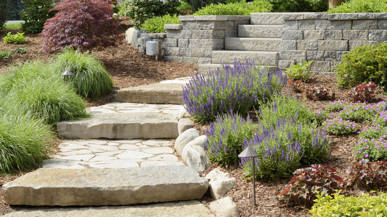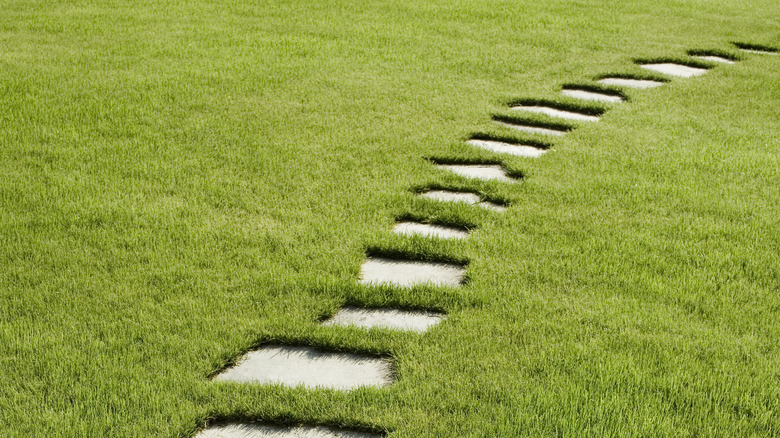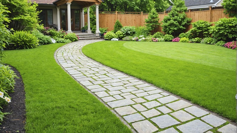 For a more informal and flexible design, a "stepping stone" pathway made with pavers offers an alternative approach to navigating your garden or backyard. Unlike the uniform look of a paver walkway, a stepping stone path allows for more creativity. The stones can be placed with varying gaps between them, giving the pathway an organic, meandering feel that blends seamlessly into the surrounding landscape. It also lets you maintain the natural beauty of your garden, letting grass, moss, or groundcover grow between the stones, further integrating the path into the environment. To enhance the look, you also have the option of filling in the gaps between the pavers with decorative gravel. If you've opted for a no-mow garden without grass, a paver walkway can still do wonders to enhance the aesthetic value of your backyard.