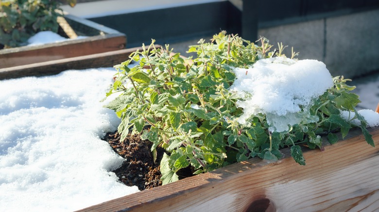 Despite the leaves of a mint plant being very susceptible to cold temperatures, the roots are actually quite hardy and can survive in temperatures as low as 5 degrees Fahrenheit. Even if the winter temperatures get lower than that in your area, you can still successfully overwinter potted mint with a few simple steps. The first step is to drastically cut back your mint plant in autumn. In fact, it is recommended that you cut off all of the foliage until just a few inches above the soil. Then, you should cover the soil in mulch — whether that is dead leaves or straw. One Redditor on r/plants even recommended covering the mint roots with the trimmed mint leaves, saying, "I've been keeping the same mint and peppermint inside a large pot for a few years by cutting the tops off and covering the roots with the cut pieces, leaves, and small twigs right before everything freezes."