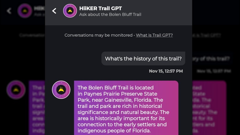 TrailGPT does offer prompts for hikers like animals in the area, the history, weather, and what kinds of shoes to wear. As I used the app more, I think I would get a better idea of what to ask, but since HiiKER is aimed at hiking newbies, a few more prompts centered on things people need to bring and be aware of before starting the hike could be helpful.