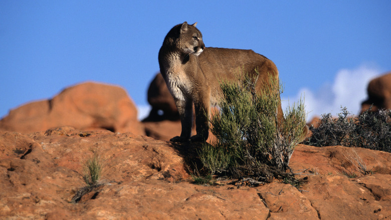 While avoiding an encounter with these felines is the best-case scenario, you should be well equipped to know what to do if you see a mountain lion. Most importantly, do not run, as this may trigger a mountain lion's instinct to attack. Instead, remain calm, try to make yourself look as big as possible, slowly wave your arms, and speak in a loud voice. The next step, should it be necessary, is to throw rocks or sticks in an attempt to scare it away.