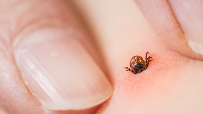 However, rubbing alcohol won't help in removing a tick that has already attached itself to your skin. Crumbley clarifies, "Ticks have barbed mouthparts that saw through the skin and anchor in when feeding." This makes it impossible for rubbing alcohol to encourage the tick to detach once it's latched on. In fact, spraying or applying rubbing alcohol to the tick won't cause it to flee — it may still kill the tick, but it won't prompt it to loosen its grip.