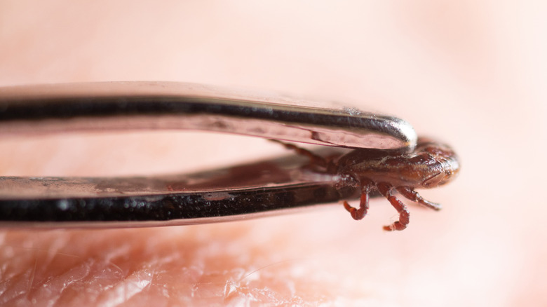 If you find a tick on your body, it should be removed as soon as you notice it. If you are using a tick removal tool, follow the instructions provided with the device. If you are using tweezers, start by grabbing the tick as close to your skin as you can. Be sure to maintain a firm grip and pull upwards in a slow, steady motion. It is important not to twist or rapidly jerk the tweezers. Such harsh movements may cause the tick's head or mouth to break off in your skin. If that does happen, try to remove the remaining pieces with tweezers. Any pieces that cannot be easily removed should just be left.