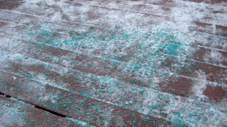 The products you use to eliminate ice and snow and prevent accumulation, like ice melt and salt, can have an adverse effect on your deck. Rock salts and any products that contain sodium chloride, will damage a variety of decking materials, including wood. Its impact on wood over time is to leave it discolored and corroded. Also avoid products that use coarse sand to add traction, which will also create scratch marks. While you can safely melt the ice on your driveway with household essentials, like vinegar, always double check before using it on a wood or composite deck. Certain things, like sand and pickle juice, can be too abrasive or acidic.