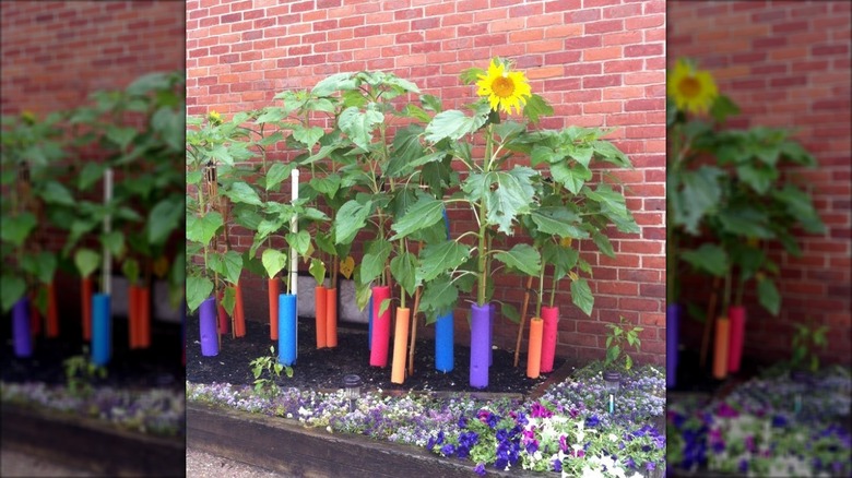 Whether you have a tall sunflower that's starting to flop or a tomato plant that's weighed down by its bounty, a pool noodle can help after a couple of modifications. First, cut the noodle into sections that are roughly a foot long. Next, slice each piece lengthwise to make its hollow middle easy to access. A utility knife such as the Amazon Basics lightweight folding aluminum utility knife is a good instrument for this task as well as an essential tool for beginning gardeners. Once you've made this cut, you'll be able to slide a plant stalk into the center gap. If any stalks or vines are curved or angled, just bend the noodle sections to accommodate their shapes. Adjust each noodle piece so it touches the soil and hugs the plant's base. Instagram user @gigi_clean has a visual of the finished setup that you may find useful, shown above.