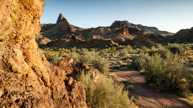 The shortest trail in the park, which begins very near the park entrance, is the Lightning Bolt Trail. Although it is only a half-mile round trip, it covers very steep terrain. Copper Mines Trail is about twice that length and, as the name implies, passes a number of abandoned copper mines. The Buckskin Loop Trail, which All Trails labels as a moderate hike, extends on both sides of Highway 95 and is a very popular trek during the spring wildflower season. Market Trail is known for combining scenic views of the Colorado River with rugged mountain terrain, while the River View Trail leads hikers to an elevated lookout that provides an expansive view of the river. Lamb Springs trail forges through the backcountry and connects to River Island State Park.