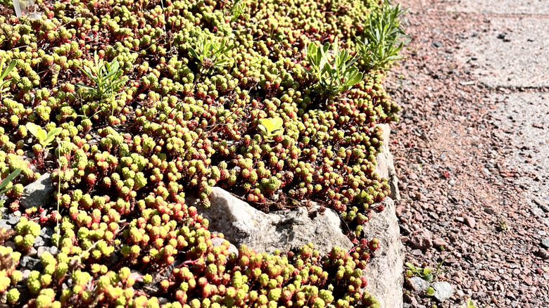 When you don't want to fight with a traditional lawn, you may try to find clever alternatives to grass for a now-mow garden. Unfortunately, most suggestions tend to veer towards the plain, such as rock gardens or xeriscaping. You don't have to settle for minimalism though, as there are plenty of plant alternatives that provide beautiful colors and groundcover. Succulents are one such option, specifically the group known as sedums. Hundreds of species fall into this category, all with different growing types, colors, and USDA zones where they thrive. However, they are all similar in the fact that they enjoy full sun and don't need much water. Most also do a great job of attracting useful insects like butterflies and bees, while being resistant to pests.