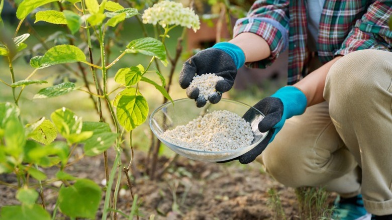 Additionally, using too much of one type of fertilizer can negatively impact your hydrangea. High-phosphorus fertilizer can impact the color of blue cultivars by limiting the plant's uptake of aluminum. Don't make this mistake beginning gardeners make way too often, and monitor how often you feed your hydrangeas. Although blue cultivars of bigleaf and mountain hydrangeas do well with modest fertilization in the spring, follow package instructions carefully for other hydrangea species, like smooth and climbing. Although you want to ensure more acidic soil, these hydrangeas will not react as seriously to pH when it comes to blooming.