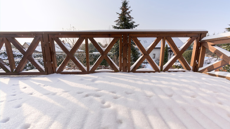 It is helpful to treat your deck or patio with a sealant on a regular basis as well. This will prevent water, as well as ice melt substances, from penetrating the materials. An easy way to tell if your deck or patio needs resealing is to spray it with a light coat of water. If the water quickly beads, your sealant should hold through the winter. However, if the water just pools or soaks in, it is time to reseal.