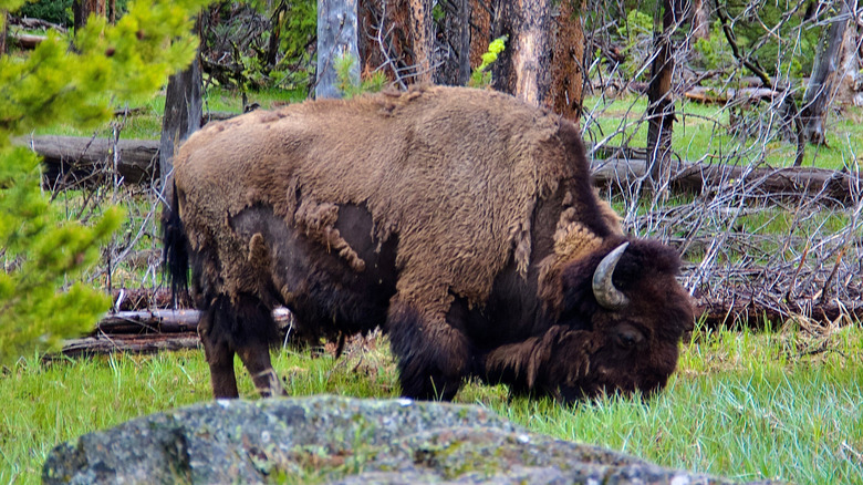 While bison are impressive to look at, they are also one of the most dangerous animals you could encounter in a national park. So, it is very important to take safety precautions seriously and stay 50 yards away. If you aren't able to accurately judge distance, you can tell if you are too close by stretching out your arm, making a thumbs up gesture, and closing one eye. If your thumb completely covers the buffalo, you are a safe distance away. However, if you can still see any part of the animal outside your thumb, you need to move back.