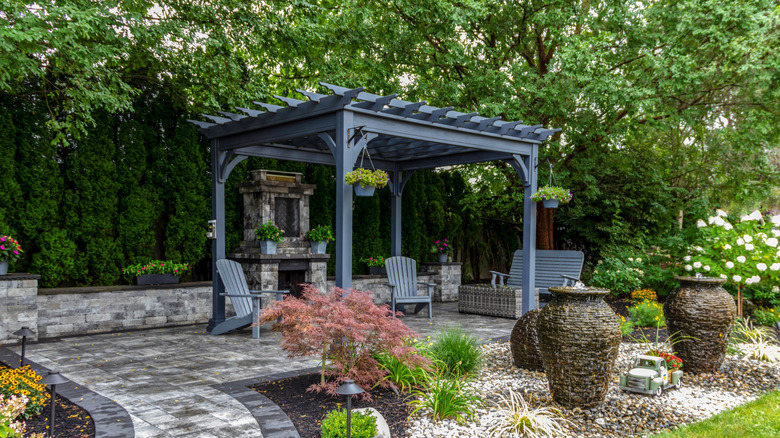 "Define the space to achieve a sense of enclosure," notes Scott. This is just as important as choosing the right furniture. Large stone pavers with grass or gravel between them make a great flooring option, while lattice panels, low stone walls, or built-in benches can help enclose the area. If you need extra shade, an arbor, pergola, or retractable awning can offer protection from the sun and light rain. Selecting durable outdoor furniture will keep maintenance to a minimum. Look for weather-resistant materials and fabrics designed to withstand the elements. Outdoor rugs, pillows, and cushions bring comfort and color while requiring little upkeep. As the sun sets, good lighting is key – string lights, lanterns, or mounted sconces can create a warm, inviting atmosphere.