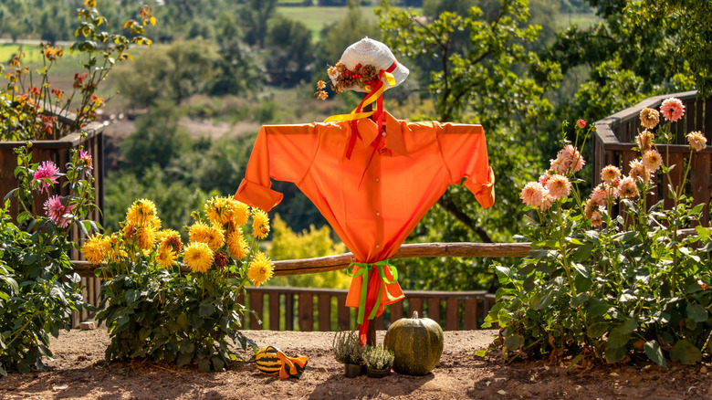 Have some clothes that don't fit and some accessories that have seen better days? Turn them into a scarecrow that can frighten rabbits and large birds away from your garden. Start by making a frame out of two old broomsticks or long, straight branches. Nail the pieces together so they look like a lowercase t. The nub at the top can hold your scarecrow's head, which might be a pumpkin or a burlap sack filled with grass clippings. If you'd like, draw a face on the head with permanent markers and make some wild hair out of vines or corn silk. Or simply dress up the nub with a hat. To help the hat stay put on windy days, attach it to the frame with a nail, a heavy-duty staple, or weather-resistant glue.