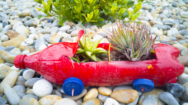 If you drink soda or bottled water, you probably have some plastic bottles on hand. These make great little planters that you can customize to reflect your design style or sense of whimsy. Have some small plants that look like they need a convertible ride? Coat a bottle with weather-resistant paint and cut an opening in the side, leaving a flap of plastic on the side closest to the bottle's neck. Bend the flap so it looks like a windshield. Then attach four bottle-cap "wheels" with toothpicks or waterproof glue. Fill your mini planter with soil, a driver, and possibly a rider in the backseat. Place it in a spot that's shielded from wind but ideal for a joyride.