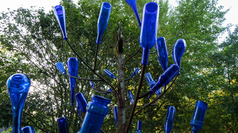 Glass bottles can be repurposed in your garden in a host of ways. If you have some that are an attractive color — for example, cobalt blue — consider turning them into a bottle tree. You can use an old tree branch, pitchfork, or coat rack as the base. Slide the bottles' openings over the branch ends, tines, or coat pegs, whatever the case may be. Then, push the tree into the ground as you would a shepherd's hook. If these materials aren't available, you can make eye-catching bottle art with metal rods. Find rods of different heights, push them into the ground, and top each with a bottle.