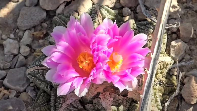 It is hard to imagine when looking at this unassuming, spineless cactus. In fact, you may not even realize it's a plant when you are looking at it unless it happens to be in bloom. That's because living rock cacti are renowned for their ability to camouflage themselves by blending in with the surrounding rocks — hence the name. Those flowers typically appear in fall and can vary in color from pink to purple to red, with yellow, filament-filled centers.