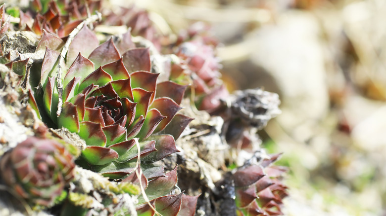 Since hens and chicks need a moisture boost only occasionally, they're ideal for water-conserving xeriscaped areas, especially rock gardens. This type of habitat takes advantage of their affection for less-than-stellar soil and spaces between stones. When choosing a planting site, keep in mind that groups of these plants are connected by a runner. This connector root originates with the largest rosette, the "mother hen," and extends to the smaller ones, her "chicks." In the spring and summer, the mother produces several broods of offset rosettes. In doing so, the plant may extend 2 to 3 feet. Vertical growth is another story. Hens and chicks taller than 4 inches are a rarity.