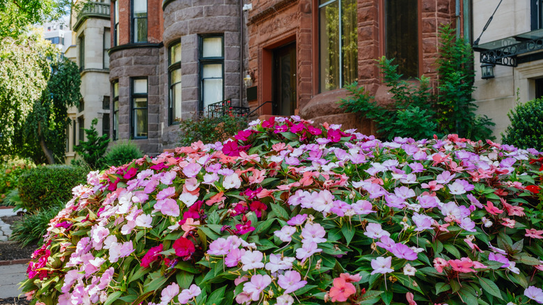 Impatiens are a big draw for hummingbirds and butterflies. Red ones are best for attracting hummingbirds to your garden. Since these creatures love their flowers so much, consider using impatiens in a pollinator garden. They're an easy-to-manage choice if you can find a shady enough site and plant them beside plants with similar soil and moisture preferences. Impatiens tend to do well next to red cardinal flowers (Lobelia cardinalis), another hummingbird favorite, as well as white turtlehead (Chelone glabra), an important host for the caterpillars of rare Baltimore Checkerspot butterflies. If you'd like to plant a shrub nearby, mountain laurel (Kalmia latifolia) makes a good companion and brings pollen-spreading bees to the yard.