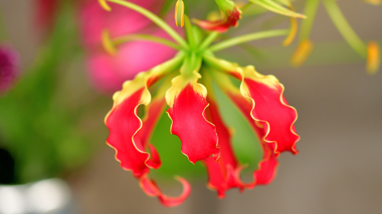 Beyond its toxicity, the other very real danger from gloriosa lily is having it overtake your garden and lawn or, worse, spread into neighboring properties. This isn't much of a threat in the northernmost portions of its range. Therefore, it is not considered invasive in those areas. However, in areas such as zones 9–11, the plant can quickly spread and take over. If you have it in your garden and don't want it to spread, you have to be diligent about removing any shoots that pop up outside the desired areas. It is also important to not inadvertently transfer seeds or portions of the roots or stems to other areas. To help prevent this, it is advised to clean garden tools after working in areas with active gloriosa lily plants. However, the only sure-fire way to prevent it from spreading is to grow it in a container.