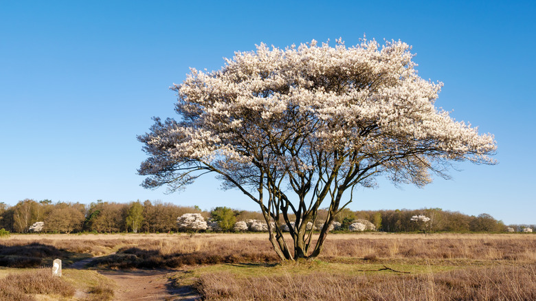 Or, opt for a serviceberry (Amelanchier spp.), another North American native that excels in zones 4 through 9. Most grow 15 to 25 feet tall and offer year-round interest, from showy spring flowers that bring bees to your garden to vibrant fall foliage that enhances your landscape. The edible berries, which appear in the summer, are likely to attract songbirds to your yard. Plus, serviceberry trees support more than 120 species of butterflies and moths. The western serviceberry (Amelanchier alnifolia) does especially well in California, Oregon, Washington, and Alaska since it's native to these states, as well as the western coast of Canada.