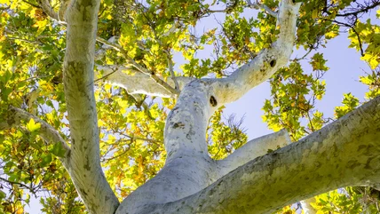 In addition to growing huge, the California sycamore grows rapidly. As it gains height, it becomes hard to prune without special equipment to reach its upper branches. This means that you'll need an arborist's help to maintain it. A California sycamore's main root can burrow 10 feet deep, and its other roots are aggressive. They've been known to harm sidewalks, pipes, septic systems, and building foundations. The giant piles of leaves that fall from this tree can vex time-strapped homeowners. Dead leaves may kill a lawn if they're not raked up promptly. They may also clog gutters and drains. Plus, a California sycamore sloughs off bark, twigs, and even branches, creating even more yardwork.