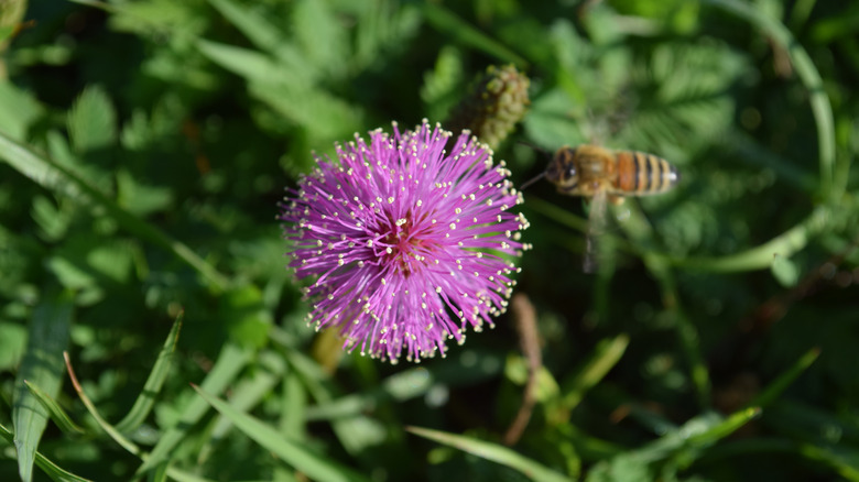 Although it appears fragile, this plant holds up quite well to foot traffic. It's commonly used in paths or among stepping stones because it will tolerate occasional trampling without appearing worn. Additionally, the plant fixes nitrogen in the soil, which enriches the soil organically over time. It not only works hard — it also plays well with others. Powderpuff mimosa is right at home in native landscapes and pollinator gardens, where it easily attracts bees and butterflies. Best of all? It's drought-tolerant once established and requires very little maintenance.