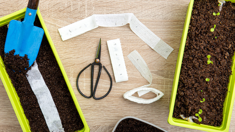 Ready to create your own seed tape? Your first step is rounding up supplies. The main items to gather are a tiny paintbrush, scissors, flour, water, and paper that decomposes safely and easily. Paper towels, toilet paper sheets, tissue paper, and newspaper work well, but avoid glossy magazine pages and paper that contains colored ink or dye. If you're out of flour or allergic to gluten, cornstarch is a good alternative. Should you go this route, you'll need a heat source to turn it into a glue-like substance. Don't have a paintbrush at home? A toothpick, cotton swab, or small makeup brush will work in a pinch. Grab a pencil or pen and a ruler, too. You'll also need seeds. Small seeds — those from lettuce or radish plants, for instance — are best for this project.