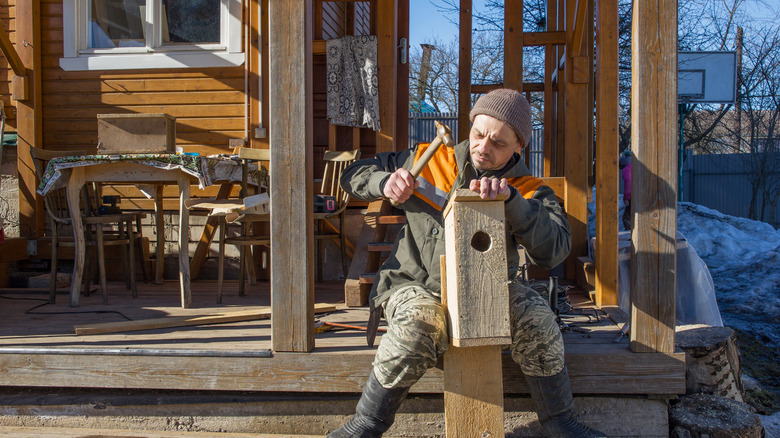 When picking out the size of a birdhouse, consider one big factor — the types of birds you want to gather. It can be easy to attract birds that serve as little helpers in your garden with the right-sized bird feeder. If you're looking to offer homes for the most common birds that grace the average backyard, like chickadees, bluebirds, swallows, and owls, go for a compact style of house. A birdhouse actually does not need to be that large to be a cozy resting place for a bird. A square base between 4 and 6 inches long is enough. However, many other species of birds have other noted preferences or needs. Northern flickers, a type of woodpecker, need larger spaces with 7 by 7 inch floors, to account for their larger size.