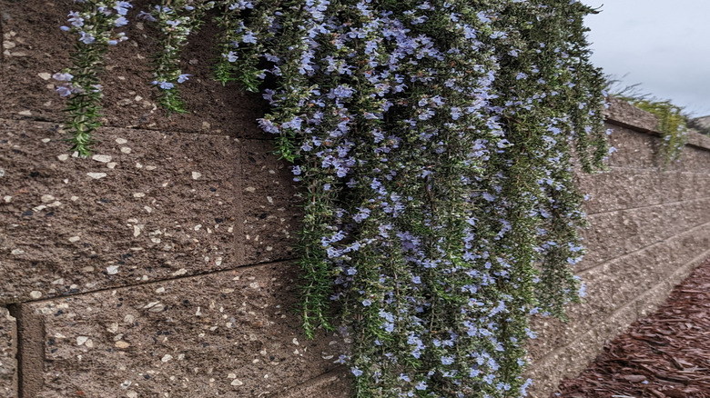 Creeping rosemary is hardy in zones 8 to 11. Providing a lovely Mediterranean vibe, it works anywhere it doesn't get too cold during the winter (though it can handle temperatures as low as 15 degrees Fahrenheit). For most of the year, especially around the end of winter, it bursts to life with bright blue flowers. They're small, but plentiful. Even lackluster plants will have beautiful spots where clusters of flowers grow interspersed in the rich green of the needle-like leaves. (Truly thriving creeping rosemary can end up completely covered in these flowers, almost drowning out the green.) It enjoys full sun and well-draining soil. Creeping rosemary also likes to stay fairly moist, but can handle some levels of drought.