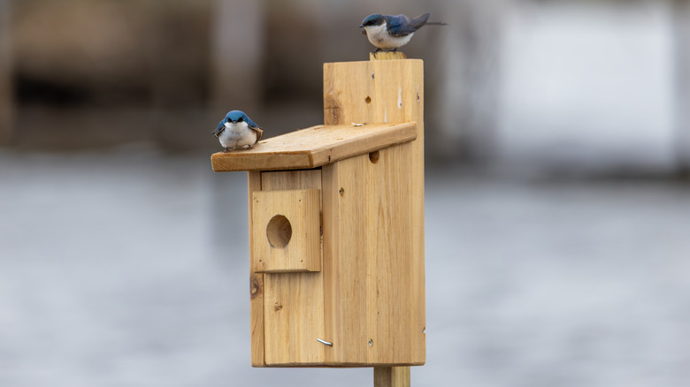 Inside your box, you won't need a perch, which can attract predatory birds. The National Wildlife Federation suggests scoring the insides of your nest box underneath the opening to give traction to fledglings when they are ready to climb out of the nest. Birds will bring in their own nesting materials to fill the cavity, so you don't need to add any yourself. While you don't want to paint the interior of a birdhouse, you can up the cuteness factor of the outside by painting it with a light-colored, latex paint that can help preserve the wood and keep the box cool.