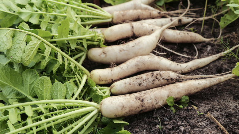 Ready to take your vegetable gardening game to the next level? Glean some wisdom from farmers who focus on building healthy soil. Many plant radishes — especially the long, white daikon type that's popular in Asian cooking (Raphanus sativus var. longipinnatus) — to improve the quality of the soil in their fields. Daikon radishes can reach lengths of 20 inches, loosening compacted ground as they grow. They also enhance their soil's nutrient profile and encourage garden-supporting microbes to flourish.
