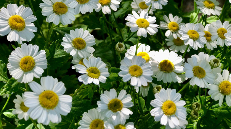 Feverfew's white-petaled flowers with yellow centers look like little daisies. This plant grows quickly, forming mounds that are 1 to 2 feet wide. It isn't fussy about soil pH, accepting neutral, acidic, or mildly alkaline conditions. Feverfew isn't very fond of clay in the ground, which tends to promote water pooling. If grown in ideal conditions — full sunlight and soil with good drainage in USDA hardiness zones 5 through 8 — feverfew may go berserk trying to reseed itself. In other words, make sure it's not spreading outside of its intended area. Deadheading the flowers can keep the plant from overproducing seeds. When you care for feverfew properly, it will offer an additional layer of pest protection to your garden.