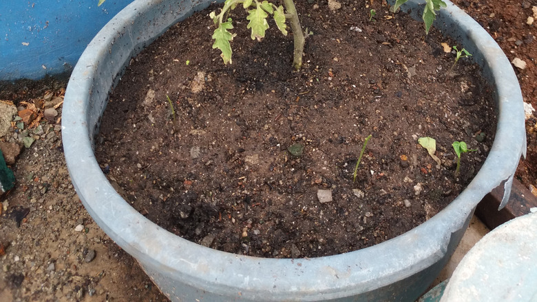 Begin by selecting an old landscape pot you are looking to repurpose. The circumference of the pot needs to be ample enough to slide over the top of the plant without damaging the leaves or any tomatoes already formed on the plant. This is easiest to do if the plants are still relatively young. If you don't have a pot large enough to place over the top, you can improvise with a smaller pot.