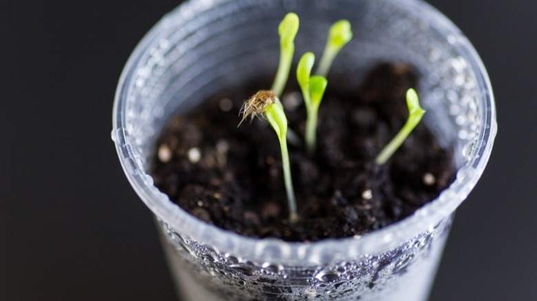 For this project, you can use a mixture of new and old items. The more you can repurpose, the better. To start, if you purchase beverages that come in plastic cups, like iced coffee or soft drinks, don't throw them away after you've finished. Instead, rinse them out, dry them, and reuse them for this project. You can also buy plastic cups for this purpose. Other supplies you'll need include plastic cling wrap, and potting soil or other growing mediums. And, of course, you should pick out some seeds to plant. There are many seeds you should consider starting indoors in spring, including tomatoes, rosemary, and petunias.