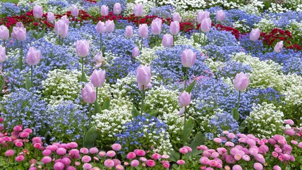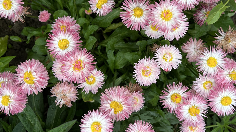 With its circle of layered white petals surrounding a bright yellow floret, the diminutive English daisy (Bellis perennis) is a classic addition to garden flower beds. Only reaching a height of three to six inches, these little flowers are easy-growing pops of color that are perfect fill-ins for small spaces and garden edges, and they do quite well in containers, too. Their white petals are sometimes tinged with pink or purple, bringing even more charm. Because they are low-growing and love well-drained soil, these daisies bring long-lasting color even to grass alternatives for a no-mow garden, such as a rock garden. The English daisy is also a pollinator-friendly flower, attracting bees and butterflies all summer long.