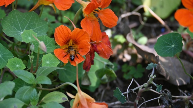 If you decide to add nasturtiums to your garden, you'll have many delights. While you can definitely eat any part of this edible plant, from its seeds and stems to its leaves and flowers, one of the biggest impacts on the garden is its ability to attract pollinators. The design of the funnel-shaped flower features a spur (called a nectary) that is filled with nectar and draws pollinators to the plant. Their bright blooms, ranging in color from red to orange to yellow, bring honeybees. Nasturtiums are also a favorite of hummingbirds. Thanks to their intensely sweet nectar and yellow-red flowers, hummingbirds cannot resist.