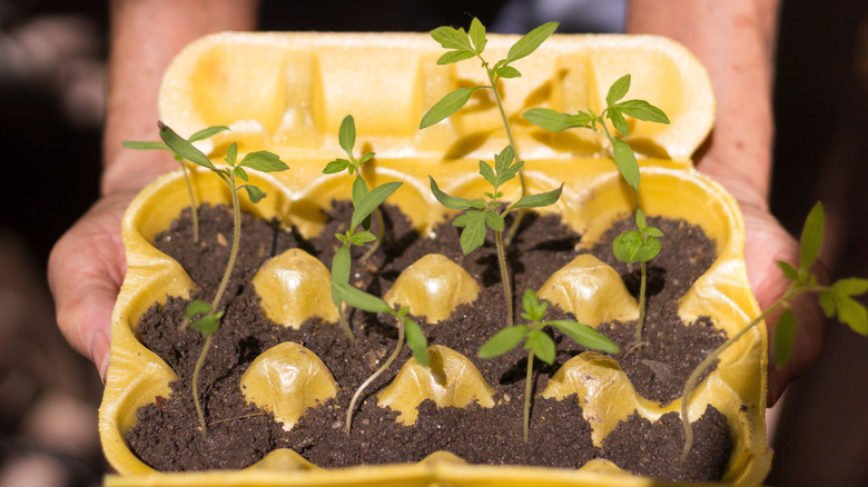 Other store-bought agricultural products come in containers that lend themselves well to seed starting, including eggs. Every type of egg carton — Styrofoam, plastic, or cardboard — can be upcycled for this purpose. However, the paper pulp cardboard models are ideal, as they are biodegradable. Egg cartons, unlike fruit containers, allow for seeds to be started in individual sections of soil. Given that they come in half-dozen, dozen, and larger variations, egg cartons provide quite a bit of flexibility.
