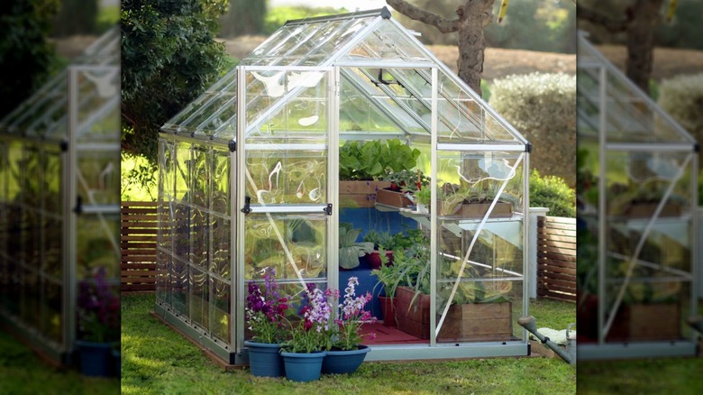 Palram Canopia's Harmony greenhouse is another great option. For just under $700, you get a 6-foot by 8-foot frame and a kit to help you get started. Generally, when you choose a greenhouse, you have to decide if you want plastic (acrylic) or glass. Plastic tends to handle stressors like impact resistance better, and be much cheaper. However, when it comes to insulation and light transmittance, glass is a clear winner.