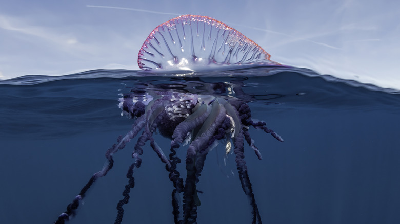 Although they are frequently mistakenly referred to as jellyfish, Portuguese man o' war are not (instead they are a siphonophore), despite their similar appearance and ability to inflict a singing sting (they are closely related). In fact, man o' war are actually not even a single creature, but rather a group of organisms that work as one to meet their collective needs. To that end, the most visible portion of a siphonophore is the purplish-blue balloon or sail that floats atop the water's surface. While this portion of a man o' war is harmless, the trailing tentacles, which are usually around 30 feet long (and can stretch up to 100 feet) on mature specimens, are covered in stinging cells. Although they are designed to immobilize small fish and other prey, they can cause severe pain, rash, and welts on humans.
