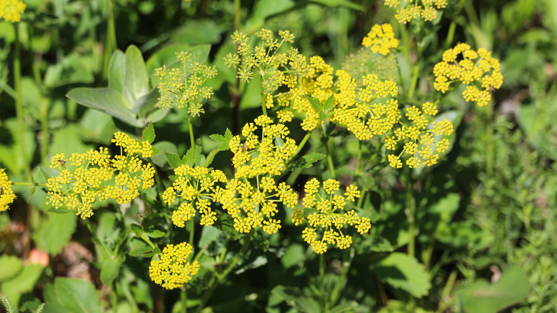 Whether you're building a pollinator garden or want an easy-care perennial for a border planting, golden Alexander has got you covered. In addition to offering eye-catching clusters of miniature flowers, its foliage ranges from vibrant green to pastel purple. The blossoms will brighten your landscape in April and May, providing food to hummingbirds before their preferred summer-blooming flowers are ready with nectar. Golden Alexander flowers also feed Black Swallowtail butterfly larvae and attract specialized bees that are important pollinators in your local ecosystem.