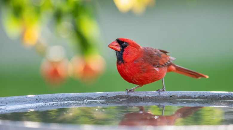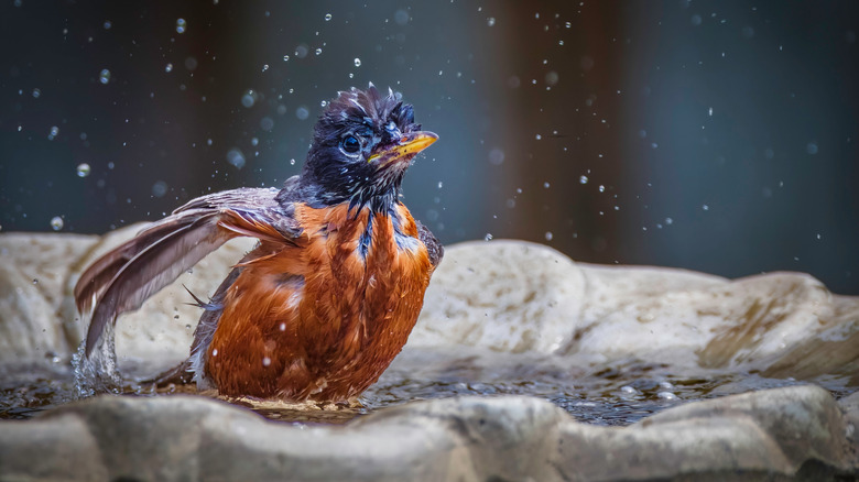 With the fire pit cleaned out, patched up, and covered with a waterproof tarp, you can begin the fun part of this endeavor — decorating. Rather than simply filling the bowl with fresh water, add in a few bright and colorful elements of nature. Depending on where you live, this could mean dropping in a few moss-covered logs, a couple of fresh flowers, or a handful of river rocks fresh out of the local creek. The rocks are probably the most integral element, as the fire pit likely has a basin that's just a tad too deep for the common bird's liking. Make sure to fill the pit with enough material to leave just an inch or two of water over the surface. No matter how you choose to decorate, be sure to leave something jutting forth from the water so that your birds have an opportunity to perch as well.