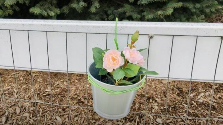 To make your hanging planter bracket, snip a wire clothes hanger with wire cutters and bend it into a straight line, keeping the hook intact. Then, wrap the wire around the rim of your planter multiple times. You could also possibly bend the hanger without cutting it. Once you have the bottom part of the hanger formed to hold your planter, bend the hook up and around to hang as needed. Alternatively, you could bend the hook around a piece of your fence or railing to hold it securely in place. For pots with a larger diameter, use two hangers twisted together. Now, hang your plant over your backyard fence or deck railing or from a tree branch.