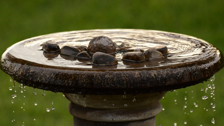If you have a serving bowl or even a storebought birdbath that's too smooth but otherwise a nice size and depth, add a few rocks to give birds a place to stand. Choose rocks that won't wobble easily; after all, the goal is to make everything feel safer for the birds. A large, flat rock that angles from the edge of the bath into the deeper part of the water is a welcome site for birds who are a little shy about dipping their feet in at first. While some suggest adding non-slip bathtub stickers to a birdbath basin, there is no way to know for certain if they'll leach chemicals into the water, particularly under direct sunlight. If you change the water daily — which helps keep the bath relatively germ- and debris-free — perhaps this isn't an issue. Fresh water each day or two also helps keep pesky mosquitoes at bay in the birdbath, as it won't allow enough time for any larvae to hatch in the water.