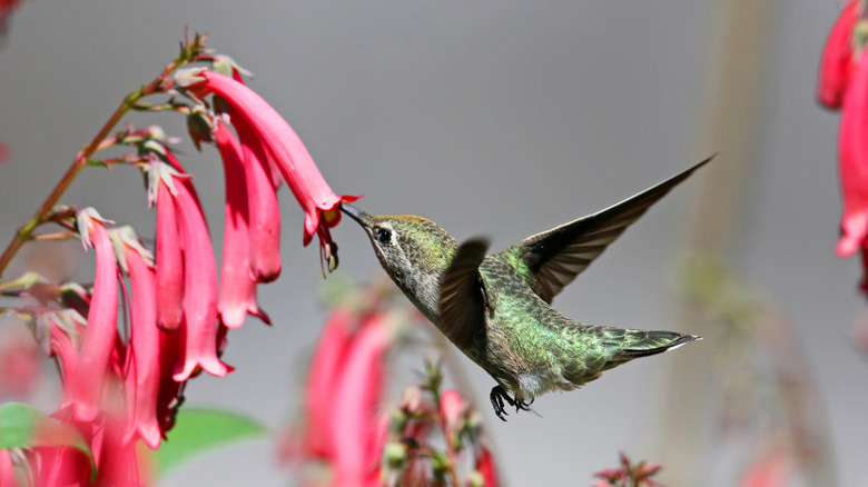 Cape fuchsia (Phygelius capensis) is one of the best flowers for luring hummingbirds to your yard because of its warm coral tones and sweet nectar. The plant's most recognizable quality is, of course, its bright pink flowers, which grow in the form of hanging tubes that are easy for hummingbirds to access with their long, stemlike beaks. The flower, also known as the less-flattering "cape figwort," is native to South Africa and grows hardily in the mountains. Since it evolved for high altitude, the plant can typically withstand temperatures as low as 0 degrees Fahrenheit and can even stay evergreen at temperatures as low as 20 degrees Fahrenheit. If you live in a warm area, these perennials will never leave your garden.
